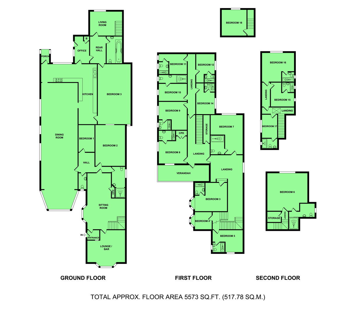 The ground floor provides lounge, bar, sitting room and a large dining room together with owner's accommodation including an office, bedroom and large kitchen.