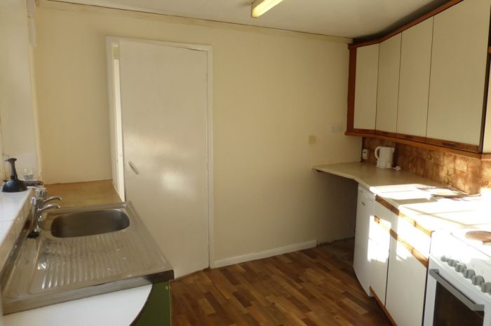 KITCHEN 10' 3" x 8' 11" (3.13m narrowing to 2.30m x 2.73m) wood effect vinyl flooring; fitted wall and base units; space and plumbing for washing machine; stainless steel sink unit; upvc double glazed window to rear.
