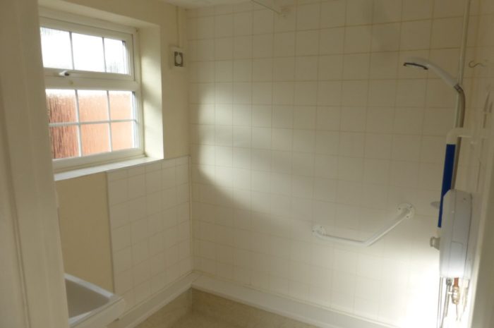 WET ROOM 5' 11" x 5' 6" (1.81m x 1.70m) waterproof flooring; frosted upvc double glazed window to rear; wall mounted sink; wall mounted electric shower.