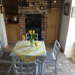 DINING AREA 7' 3" x 13' 9" (2.23m x 4.20m) brickwork flooring; beamed ceiling; dresser; table and chairs; ornate brick fireplace with artificial AGA in situ (the fireplace is not operational); steps down to Kitchen.