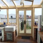 KITCHEN 8' 7" x 9' 4" (2.63m x 2.87m) wooden floorboards; fitted wall and base units with worksurface over; freestanding gas cooker; Belfast sink; fridge freezer; wooden double glazed door and windows leading onto decking area.