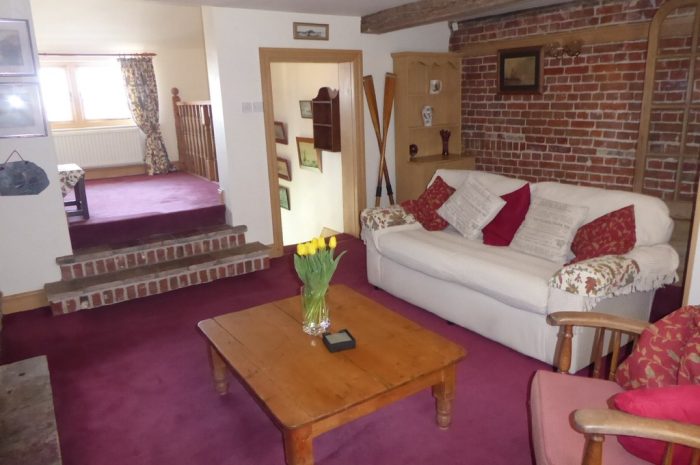 LOUNGE 14' 7" x 14' 7" (4.45m x 4.47m) carpet; open brick feature fireplace with tiled hearth; window to front; three seater sofa and chair; carpeted stairs leading down to Dining and Kitchen areas; steps leading up to a raised area with stunning views of River Yare via double glazed window; door leading to Bathroom.