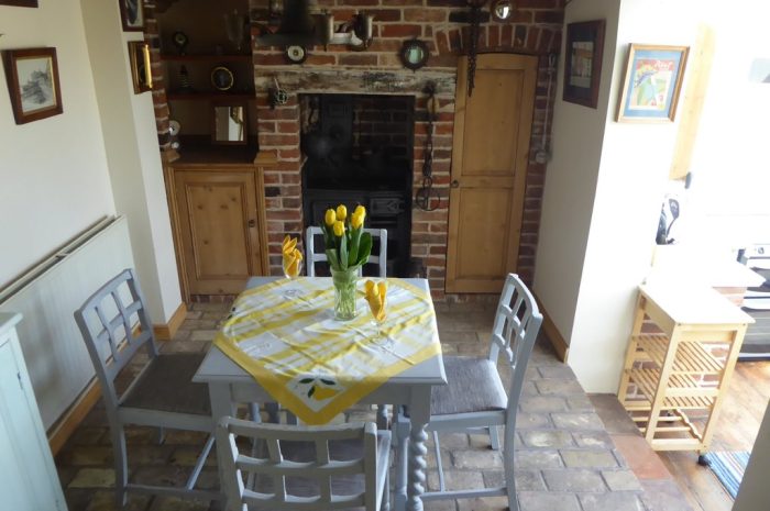 DINING AREA 7' 3" x 13' 9" (2.23m x 4.20m) brickwork flooring; beamed ceiling; dresser; table and chairs; ornate brick fireplace with artificial AGA in situ (the fireplace is not operational); steps down to Kitchen.