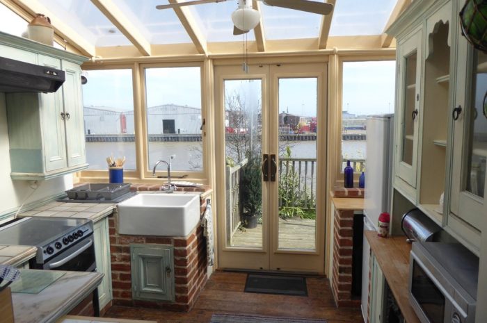 KITCHEN 8' 7" x 9' 4" (2.63m x 2.87m) wooden floorboards; fitted wall and base units with worksurface over; freestanding gas cooker; Belfast sink; fridge freezer; wooden double glazed door and windows leading onto decking area.