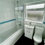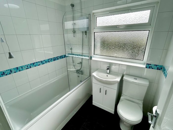 BATHROOM 6' 10" x 5' 6" (2.1m x 1.7m) newly fitted tile effect vinyl flooring; frosted UPVC double glazed window; brand new suite comprising of low level wc; hand wash basin with white gloss vanity unit beneath; bath with electric shower over and glass shower screen to side.