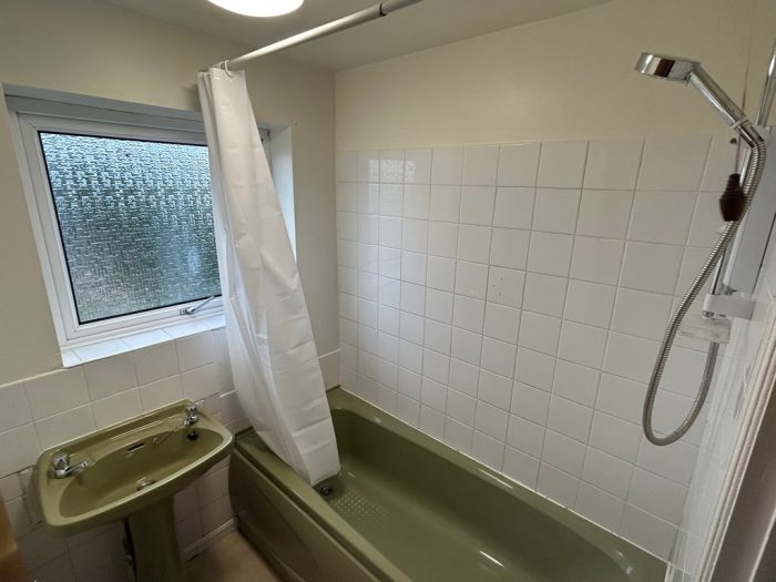 BATHROOM vinyl flooring; radiator; bath with electric shower over; sink unit; frosted double glazed window to rear.