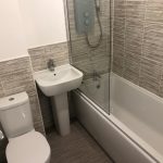 BATHROOM fitted vinyl flooring; newly fitted white modern suite comprising of low level wc; hand wash basin; bath with electric shower over; tiled splashback areas.