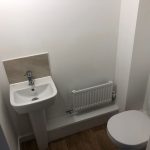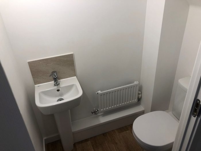 CLOAKROOM wood effect vinyl flooring; radiator; modern white suite comprising of low level wc and hand wash basin.