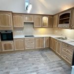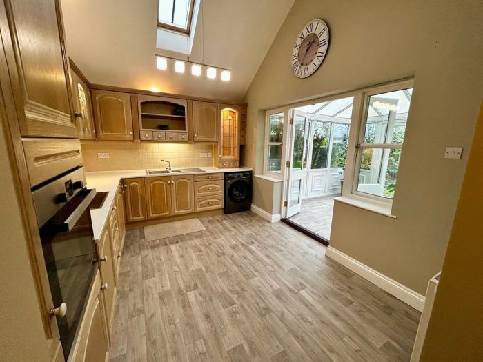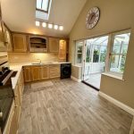 KITCHEN 12' 9" x 10' 4" (3.9m x 3.17m) newly fitted flooring; a range of fitted wall and base units; newly fitted inset sink with glass wash; electric four ring hob with extractor hood over; integrated fridge and freezer; brand new electric single oven; space and plumbing with washing machine (left as goodwill); radiator; pantry cupboard; Velux skylights; double doors leading to: