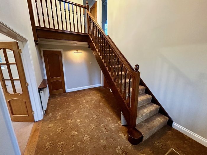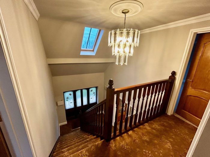 FIRST FLOOR LANDING fitted carpet; galleried landing with chandelier light fitting.