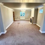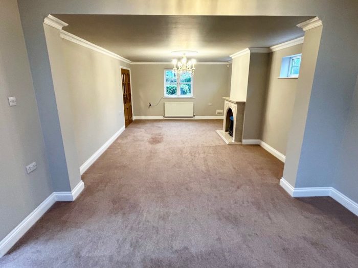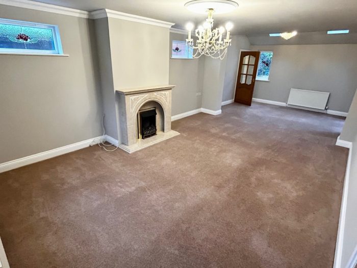LOUNGE 28' 6" x 12' 9" (8.71m x 3.91m) fitted carpet; feature fireplace with electric fire; chandelier light fitting; radiator; triple aspect UPVC windows to front, side and rear and double French doors to fourth side leading to the enclosed outside courtyard area, door into: