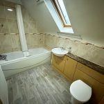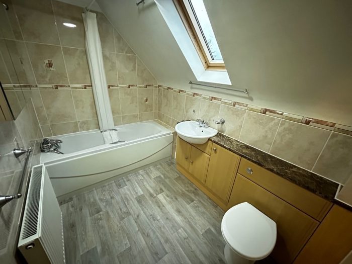 BATHROOM 9' 1" x 5' 10" (2.77m x 1.8m) newly fitted vinyl flooring; vanity unit with sink and wc; bath with showerhead attachment over; Velux window; radiator; wall mounted cabinet.