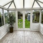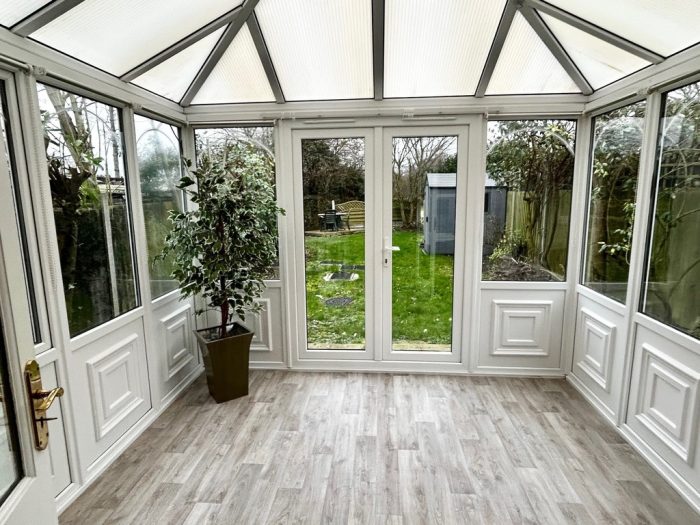 CONSERVATORY 10' 0" x 9' 10" (3.05m x 3m) newly fitted vinyl flooring; UPVC windows to three sides; double doors leading onto the garden.