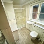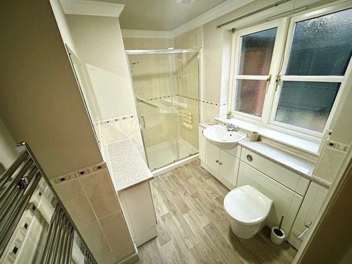 EN SUITE newly fitted vinyl; vanity unit with sink and wc; additional cupboard unit with surface and mirror over; shower enclosure with newly fitted mains connected shower; heated towel rail/radiator; UPVC window to rear.