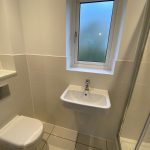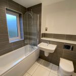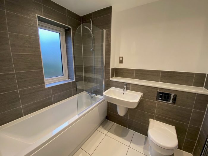 BATHROOM bath with mixer tap and shower attachment; wash hand basin; wc; half tiled walls; tiled flooring; chrome heated towel rail; downlights; shaver point; extractor fan; frosted window.