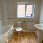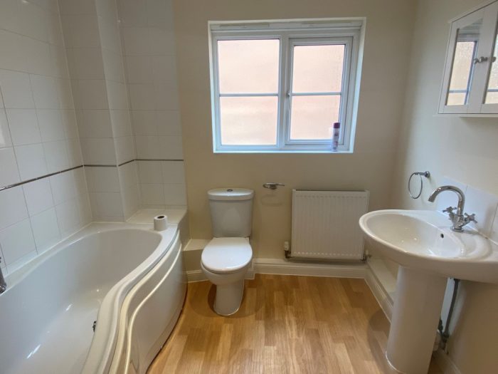 BATHROOM vinyl flooring; modern white suite comprising of low level wc; hand wash basin; bath with mains connected shower over; frosted double glazed window; radiator.