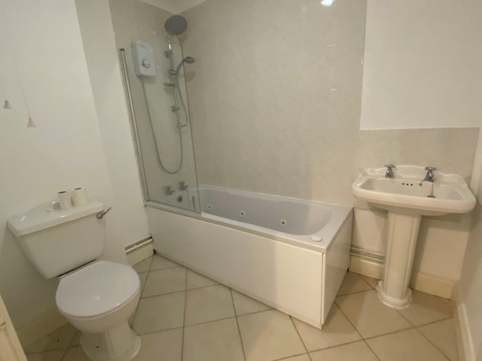 BATHROOM 7' 6" x 5' 10" (2.3m x 1.8m) tiled flooring; white suite comprising of a low level wc; hand wash basin; bath with electric shower over.