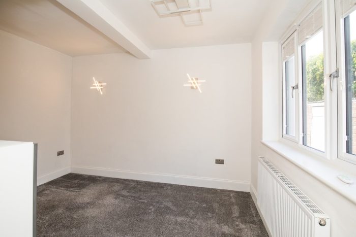 STUDY / BEDROOM 5 carpet; radiator; double glazed window to side; built in display cupboard; two feature wall lights.