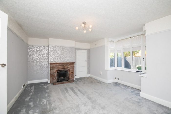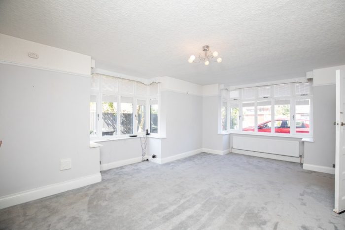 RECEPTION 1 / LOUNGE carpet; bay windows to front and side aspects with built in blinds to windows; brick feature fireplace (not in use); door to Study/Bedroom 5.