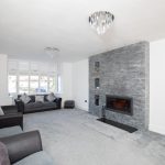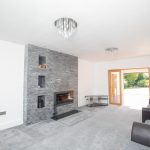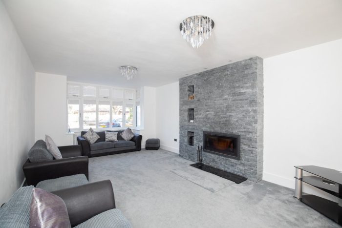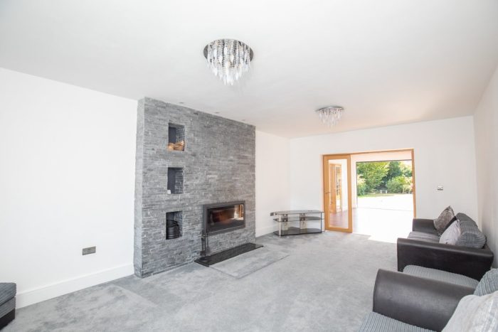 RECEPTION 2 / SITTING ROOM carpet; radiator; bay window with built in blinds to windows; floor to ceiling feature fireplace with integrated wood burner; two sofas, armchair and two footstools.