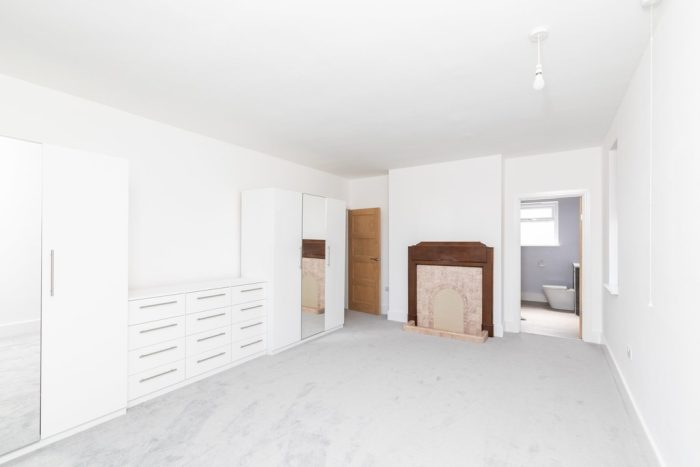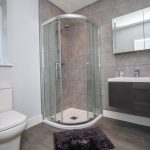 EN SUITE laminate flooring; beautiful fitted white modern suite with corner shower cubicle with mains connected shower; low level wc; twin sinks within white gloss vanity unit with large illuminated mirror over; frosted double glazed window to rear; wall mounted towel warmer/radiator.