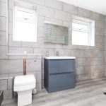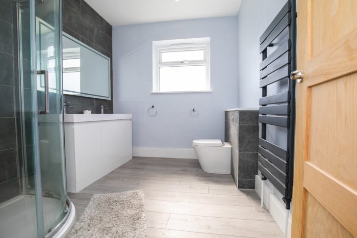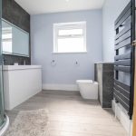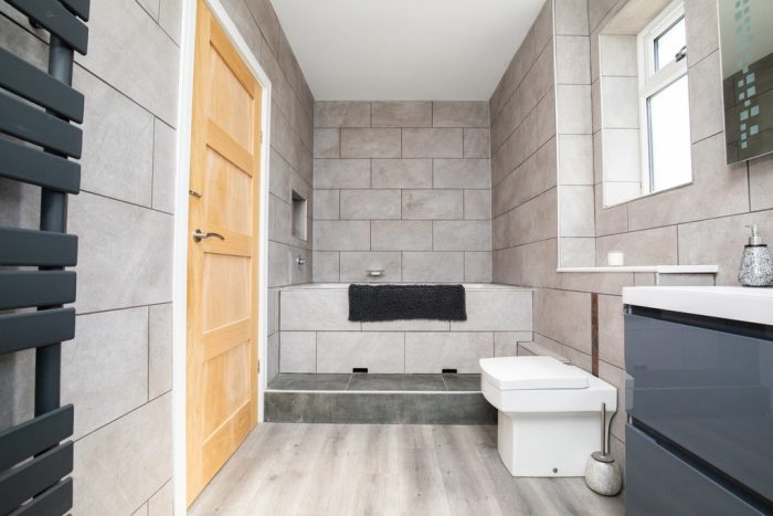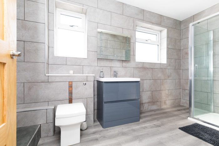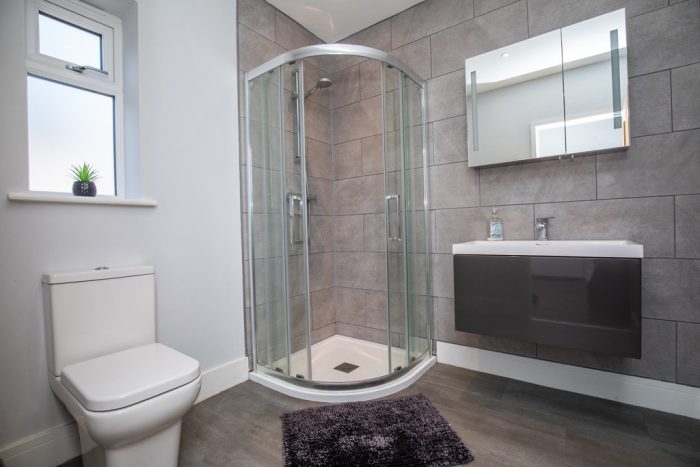 FAMILY BATHROOM laminate flooring; fully tiled walls; a modern fitted suite with walk in shower cubicle with mains connected shower with handheld and waterfall showerheads; large sink within grey gloss vanity unit with illuminated mirror over; low level wc; raised bath with slimline wall mounted waterfall tap; frosted double glazed windows; wall mounted towel warmer/radiator.