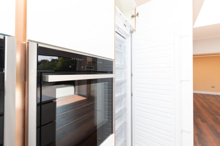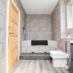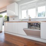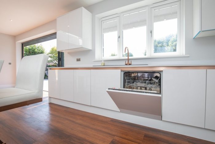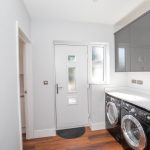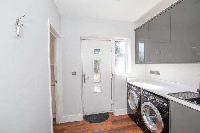 UTILITY ROOM Karndean flooring; grey gloss wall and base units with black composite sink; washing machine and tumbler dryer (left as goodwill); cupboard housing boiler; composite door to rear garden; door to Shower Room.