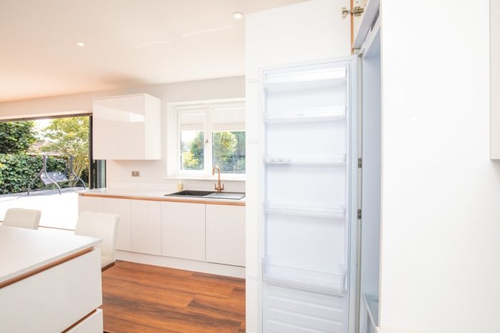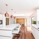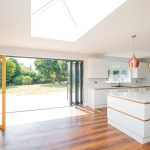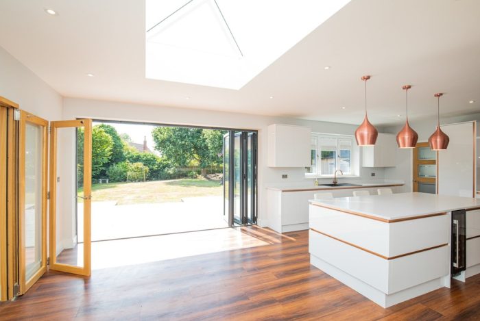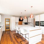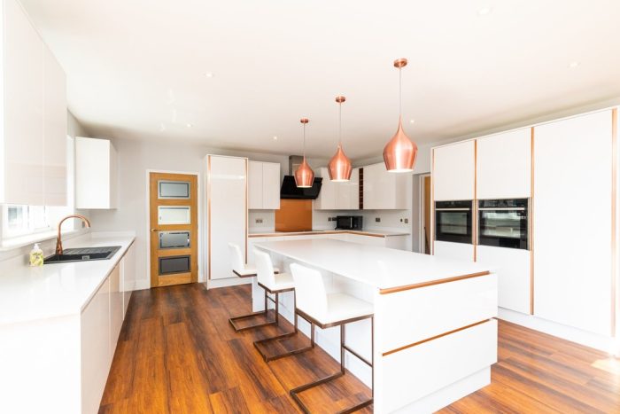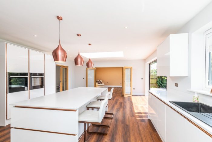 KITCHEN / DINING ROOM beautifully fitted kitchen with extensive range of white gloss wall and base units with rose gold detail and white sparkle worksurface over; built in appliances including two ovens, large freezer, wine fridge, large fridge, dishwasher; composite sink and drainer with brass mixer tap; large central island with units and drawers below; three rose gold hanging lights over and bar stools; bifolding doors on to patio and garden beyond; large dining area with skylight over; Karndean flooring; doors to Utility, Sitting Room and Sun Room.