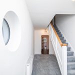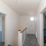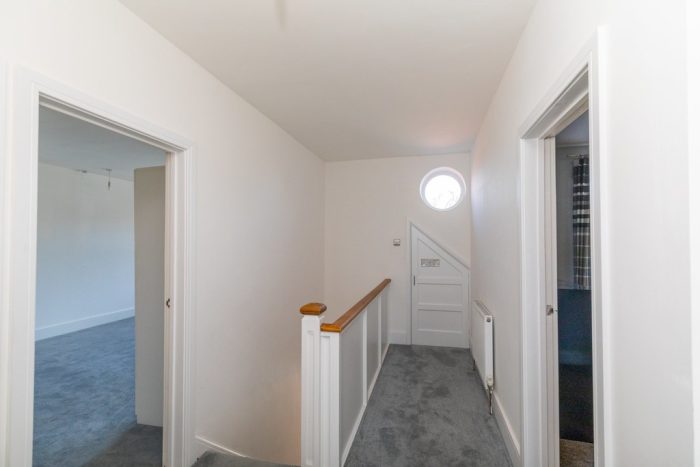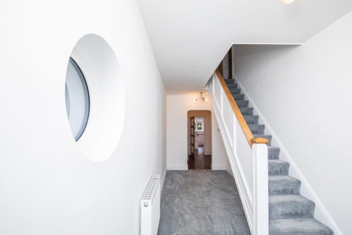ENTRANCE HALLWAY carpet; radiator; feature round window to side; carpeted stairs to first floor; doors leading into the front Lounge, Study/Bedroom 5 and Kitchen.