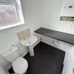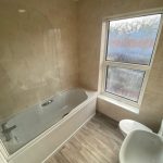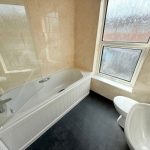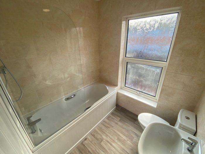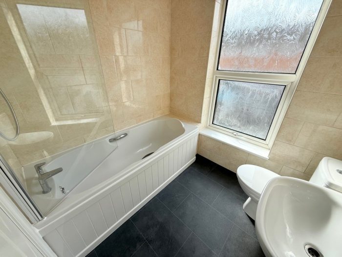 BATHROOM pedestal wash hand basin; wc; bath with mains connected shower; chrome heated towel rail; fully tiled walls; frosted window; extractor fan, newly fitted vinyl flooring.