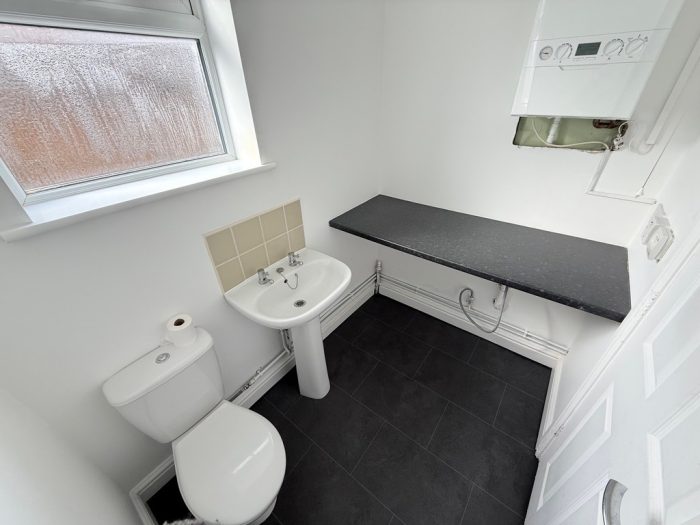 CLOAKROOM / UTILITY wc; pedestal wash hand basin; worktop with space and plumbing for washing machine and space for tumble dryer; gas boiler; frosted window, newly fitted vinyl flooring.