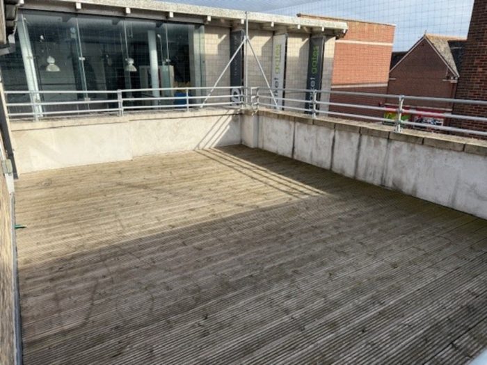 OUTSIDE Accessed via stairs from the Entrance Hall, there is a decked area with outside lights and sockets as well as secure seagull netting over.