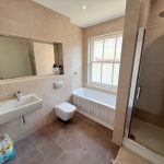 BATHROOM 8' 11" x 7' 9" (2.73m x 2.38m) tiled flooring; quality suite comprising wall mounted sink unit; low level wc; bath; separate shower cubicle; wall mounted towel radiator; downlights; sash window.