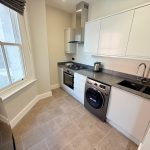 KITCHEN 9' 2" max x 8' 9" max (2.80m x 2.68m) tiled flooring; fitted kitchen with granite worktops; integrated Samsung oven and gas hob with extractor over; Samsung washing machine and fridge freezer (provided by the Landlord as goodwill); corner sash window; downlights.