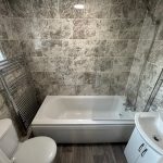 BATHROOM 6' 6" x 4' 7" (2.0m x 1.4m) wood effect vinyl flooring; white suite comprising of low level wc; hand wash basin with white vanity unit beneath; bath with mixer tap and showerhead attachment over with glass screen to side; wall mounted towel warmer/radiator; small frosted double glazed window to side; fully tiled walls.