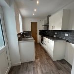 KITCHEN wood effect vinyl flooring; white wall and base units with three drawer unit and vinyl worksurface over; built in electric oven with four ring electric hob and extractor hood over; stainless steel sink with mixer tap and draining board; double glazed door and window to rear yard; space for washing machine and fridge freezer; door to Bathroom.