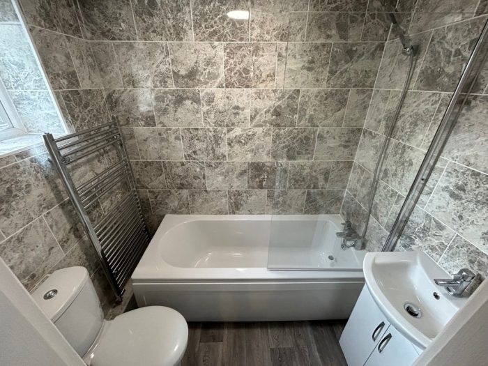 BATHROOM 6' 6" x 4' 7" (2.0m x 1.4m) wood effect vinyl flooring; white suite comprising of low level wc; hand wash basin with white vanity unit beneath; bath with mixer tap and showerhead attachment over with glass screen to side; wall mounted towel warmer/radiator; small frosted double glazed window to side; fully tiled walls.