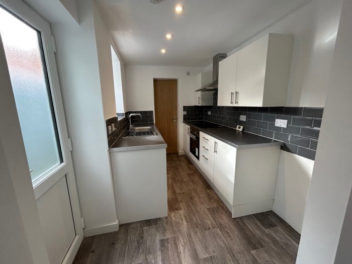 KITCHEN wood effect vinyl flooring; white wall and base units with three drawer unit and vinyl worksurface over; built in electric oven with four ring electric hob and extractor hood over; stainless steel sink with mixer tap and draining board; double glazed door and window to rear yard; space for washing machine and fridge freezer; door to Bathroom.