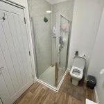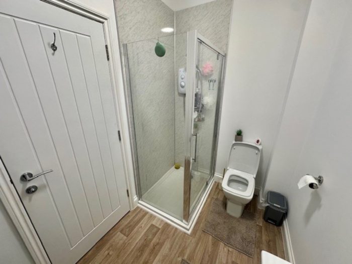SHOWER ROOM 7' 10" x 5' 4" (2.40m x 1.64m) vinyl flooring; large shower cubicle with wall mounted electric shower unit; low level wc; hand wash basin; wall mounted towel radiator.