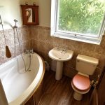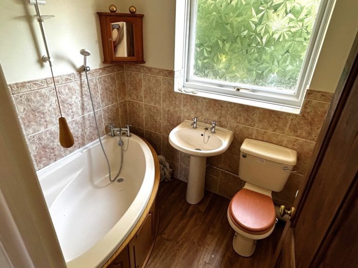 BATHROOM 6' 7" x 5' 5" (2.03m x 1.67m) vinyl flooring; three piece suite including corner bath with shower over; wash hand basin; low level wc; window to rear.