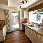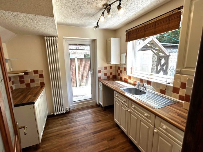 KITCHEN 8' 8" x 8' 2" (2.66m x 2.51m) laminate wooden flooring; a range of floor and wall mounted white fronted cupboards and drawers; stainless steel extractor fan; single drainer stainless steel sink unit; glazed door to side parking area; window to rear garden.
