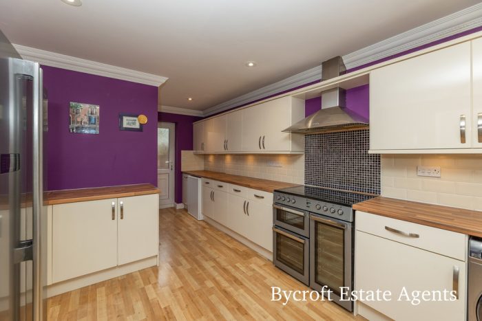 KITCHEN 19' 1" x 10' 9" (5.84m x 3.28m) laminate flooring; modern fitted wall and base units; space for white goods; Range style oven with extractor hood over; 1½ bowl sink drainer; UPVC double glazed window to front aspect; UPVC double glazed door to rear aspect leading out into the rear garden.