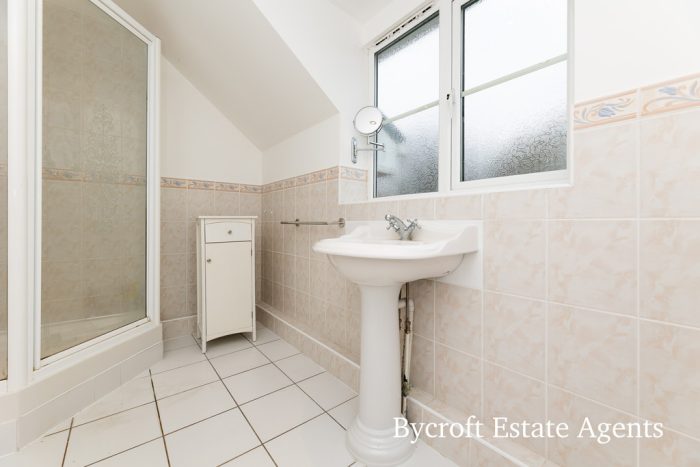 EN SUITE 10' 9" x 5' 8" (3.28m x 1.75m) tiled floor; hand wash basin; wc; walk in corner shower cubicle with wall mounted shower unit; UPVC double glazed window.