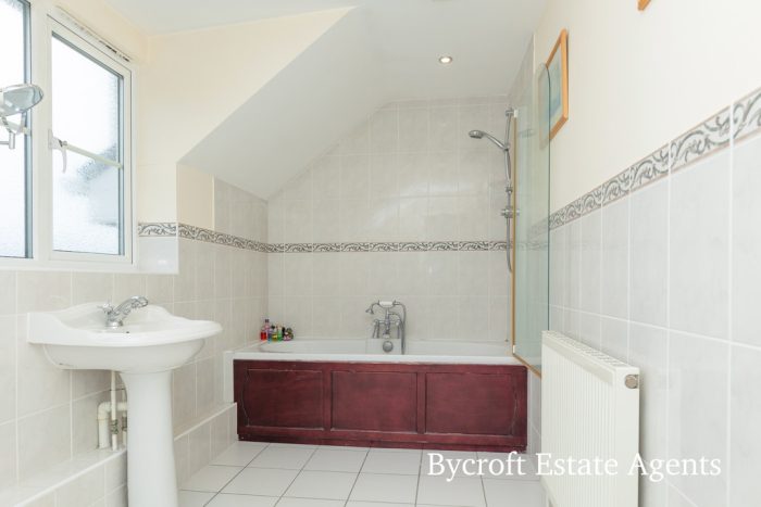 BATHROOM 12' 2" x 5' 8" (3.73m x 1.75m) tiled floor; bath with telephone style shower head on mixer tap and wall mounted further shower unit over; wc; hand wash basin; UPVC double glazed window to front aspect; radiator.
