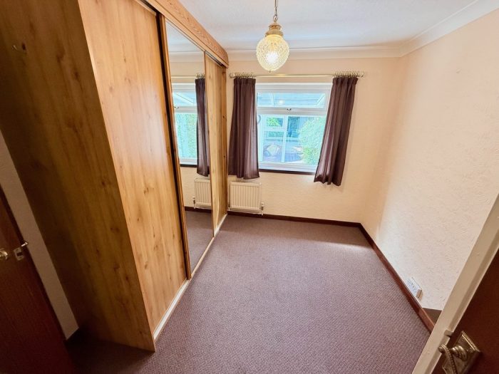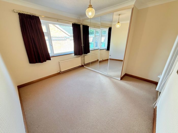 BEDROOM 2: 8' 10" x 10' 5" (2.7 + wardrobes x 3.2m) carpet; radiator; double glazed window to side with curtain pole and curtains; two sets of double mirrored wardrobe doors with lock to the front with shelving and hanging rail inside.