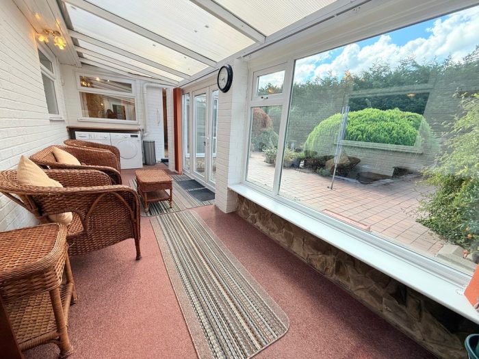 CONSERVATORY/SUN-ROOM: fitted carpet; double glazed windows and doors overlooking the garden with fitted blinds; wicker conservatory furniture comprising of double seat, 2 single seats and a table; work surface area with plumbing and electrics for freestanding Bosch washing machine and tumble dryer (left as goodwill); fully glazed double glazed door leading into the;