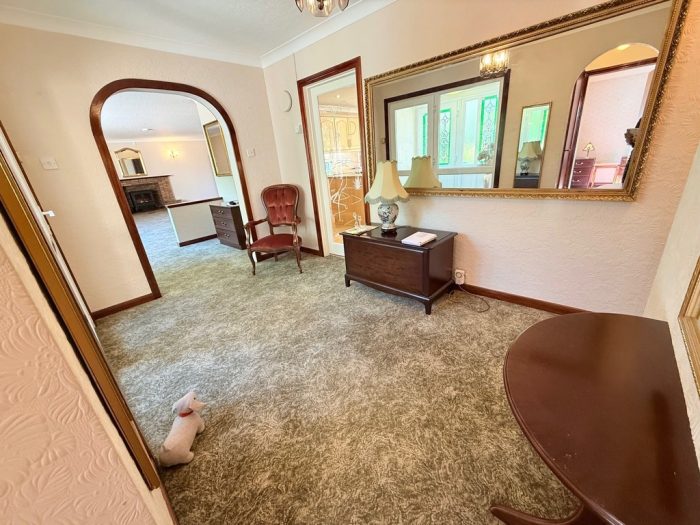 LARGE ENTRANCE HALLWAY: carpet; archway leading into the lounge; doors to kitchen; all 3 bedrooms; family bathroom and three storage cupboards 2 with overhead storage compartments and one full sized one, each having shelving inside providing ample storage space; access to loft; a large open area which would provide a pleasant seating area if required.