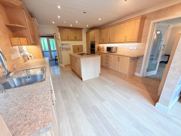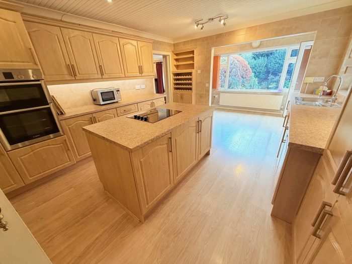 KITCHEN: 20' 11" x 12' 5" (6.4m x 3.8m) laminate flooring; range of good quality wood effect wall and base units all fitted within recent years; good range of cupboard space and drawer units. Offering many features to include a built-in wine rack with shelving; large larder cupboard with built-in safe; further large storage cupboard housing the Worcester oil boiler; built-in Bosch dishwasher; niche inset narrow cupboards ideal for spices and storage; built-in Bosch double oven; central island with cupboards and drawer units with Lamona electric ceramic hob fitted within. Vinyl work surface; stainless steel sink with drainer with hot and cold mixer tap; separate drinking tap with water softener in the cupboard beneath (this would be the tenants responsibility if they want to use this); radiator; double glazed window looking into to the conservatory; breakfast table/seating area with double glazed window overlooking the rear garden with fitted blind; free standing Samsung American style fridge freezer (left as goodwill); fully glazed double glazed door leading into the conservatory and internal door leading back into the hallway(Agents note: microwave which can be left if required, as goodwill).