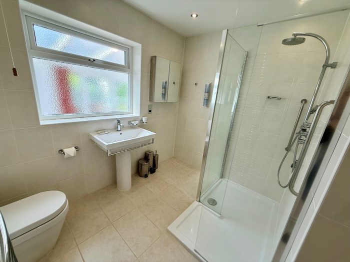 FAMILY SHOWER ROOM: fully tiled walls and floor; recently fitted suite comprising of walk-in double sized shower enclosure with mains connected shower with waterfall and handheld shower heads, screens to sides; hand wash basin with hot and cold stainless steel mixer tap and towel rail built-in; low level WC; wall mounted large towel warmer/radiator; wall mounted mirror fronted bathroom cabinet x 2; frosted double glazed windows to rear; built-in storage cupboards housing the hot water tank with overhead shelving area.