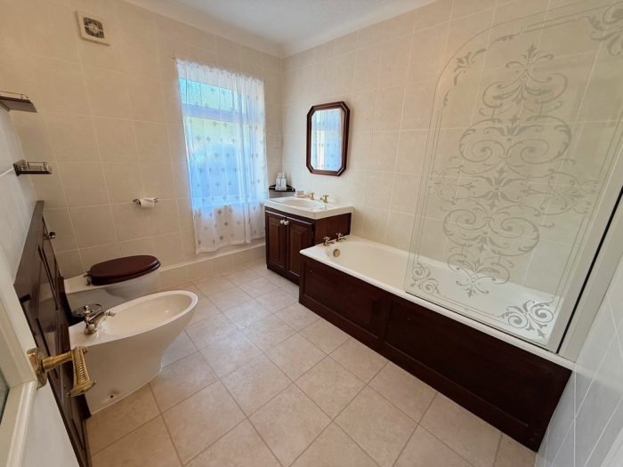 ENSUITE: 9' 2" x 7' 2" (2.8m x 2.2m) fully tiled walls and floor; wall mounted towel warmer/radiator; bathroom comprising of bath with mahogany side panel, mains connected shower; glass screen to side; sink within vanity unit; low level WC with enclosed cistern and freestanding bidet; frosted window.